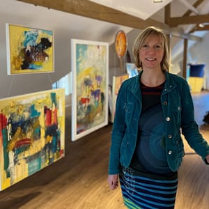 Mit ihren farbenfrohen, abwechslungsreichen und abstrakten Bildern bringt sie Leben in die Kulturscheune.