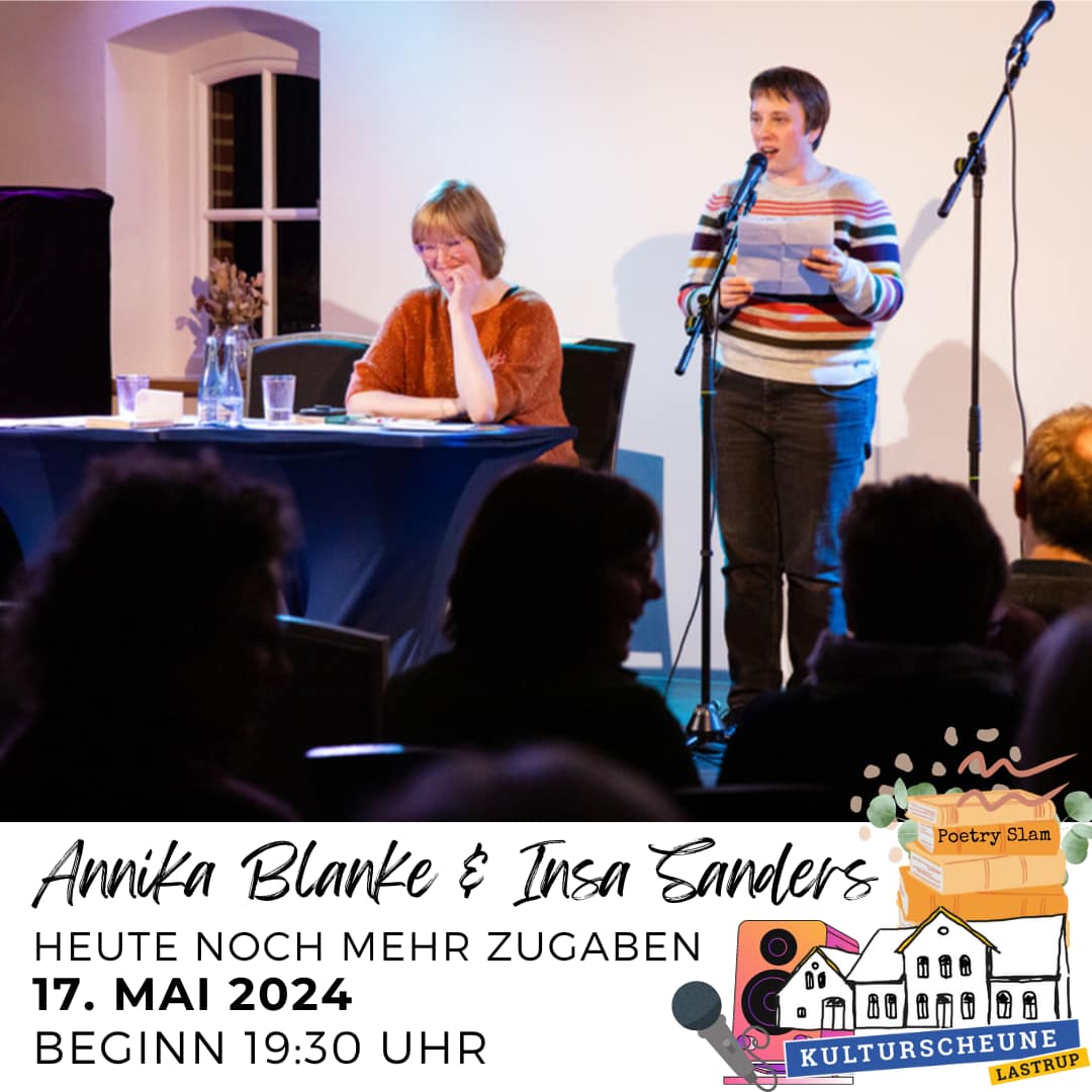 Als Annika Blanke und Insa Sanders zum ersten Mal Lastrup auftraten, wollte das Publikum gar nicht wieder nach Hause. Auch die beiden Autorinnen aus Oldenburg und Berlin hatten so viel Spaß, dass sie im Jahr 2024 wieder zurückkommen. Sie machen dort weiter, wo sie aufgehört haben und lesen den ganzen Abend ihre Texte vor. Im Gepäck: Geschichten für alle Lebenslagen, pointierte Alltagserlebnisse und gekonnte Sprachjonglage mit Einfallsreichtum, Intelligenz und einer großen Portion Humor.