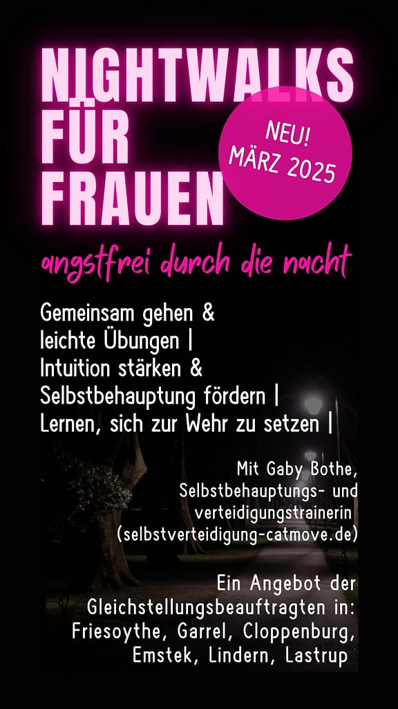 Am 25. März 2025 findet in Lastrup erstmals der Nightwalk statt. Eine Veranstaltung, die von den Gleichstellungsbeauftragten im Landkreis Cloppenburg organisiert wird. Ziel dieser Aktion ist es, Frauen und Interessierten praktische Tipps und Übungen zu vermitteln, wie sie sich in der Dunkelheit sicherer fühlen und besser durch den Abend navigieren können. Unter der Leitung von Gaby Bothe, einer erfahrenen Selbstbehauptungstrainerin, wird den Teilnehmerinnen gezeigt, wie sie ihre Wahrnehmung schärfen, potenziell gefährliche Situationen frühzeitig erkennen und sich in stressigen Momenten souverän und sicher verhalten können.