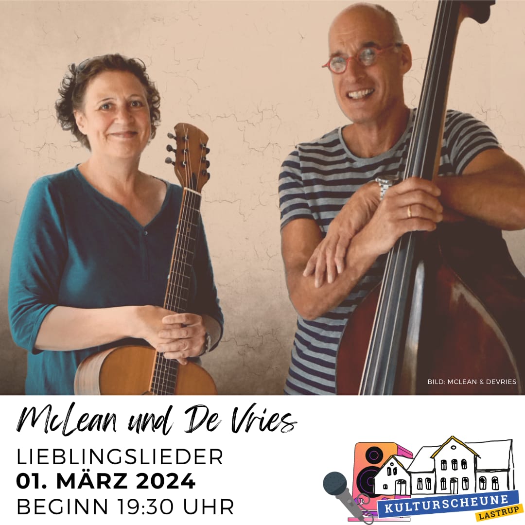 Dieses Duo mit Insa McLean aus Aurich (Gitarre, Akkordeon, Flöte, Gesang) und Henk de Vries aus Groningen (Bass, Gitarre, Gesang) bietet akustische Musik mit deutschen, plattdeutschen, holländischen und englischen Texten.